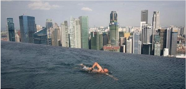 在新加坡濱海灣金沙酒店55層高的塔樓頂端,一位客人正在空中花園巨大的泳池中游泳。