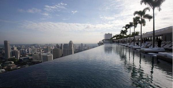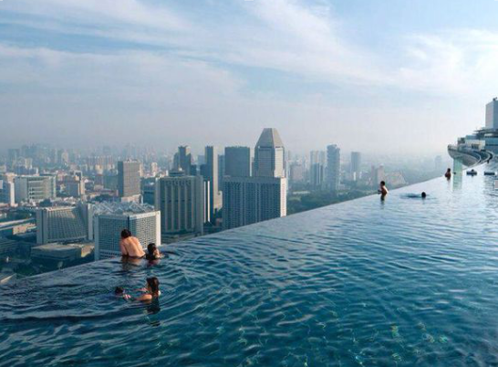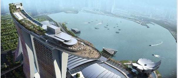 新加坡濱海金沙酒店塔樓的空中花園以及巨大的游泳池。據(jù)設(shè)計師莫舍?薩夫迪介紹說,三座塔樓是根據(jù)一副牌的形狀來設(shè)計的。