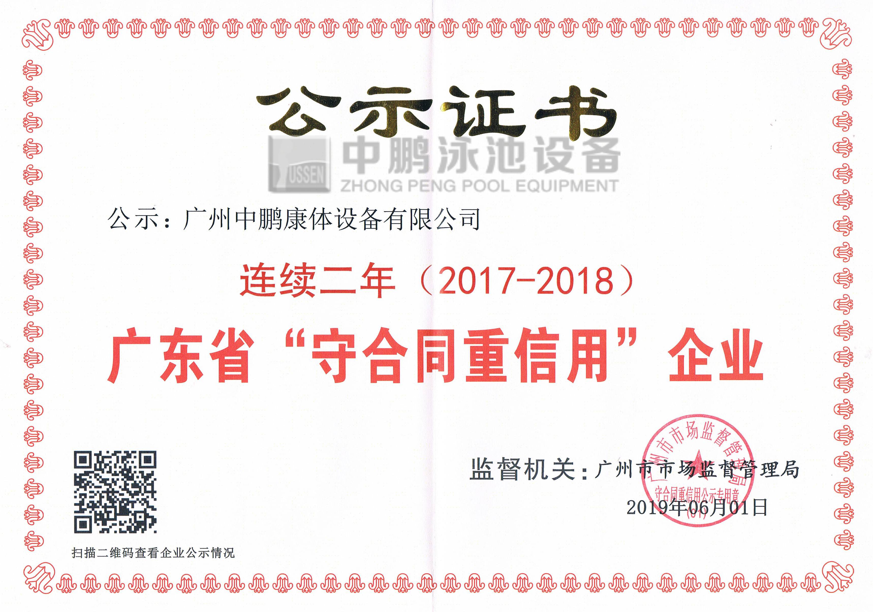 廣州中鵬康體設備有限公司連續2年榮獲廣州市工商行政管理局頒發的“廣東省守合同重信用企業”榮譽證書和牌匾, 上述連獲榮譽稱號的取得,意味著公司在行業信用方面取得了政府權威機構的認可,是對公司信用度的肯定,是公司實力的表現。以上榮譽的取得也有助于拓展公司業務,提高公司業務承攬能力,為公司業績的增長提供支持。同時,擴大了公司休閑康體領域的影響,對公司提高綜合競爭并實現長遠發展目標具有重要戰略意義。
